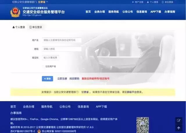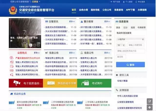 1.Android(安卓)用户在应用市场,搜索下载“交管12123”手机app,iPhone(苹果)用户在app store搜索下载“交管12123”手机app,或者可在浏览器输入http://gs.122.gov.cn,打开甘肃公安厅交通警察总队交通安全综合服务管理平台,点击如下红框所标识的“app下载”,按照页面提示,扫码并下载app。
